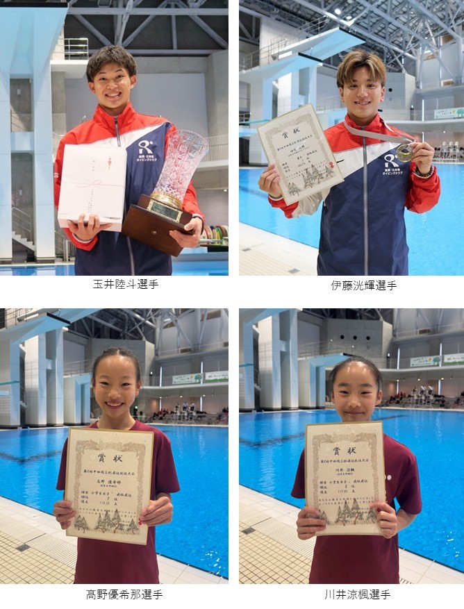 【結果】 玉井陸斗選手 男子高飛込 優勝 伊藤洸輝選手 男子飛板飛込 優勝 髙野優希那選手 小学生女子飛板飛込 7位 川井涼楓選手 小学生女子飛板飛込 8位 ご声援ありがとうございました。