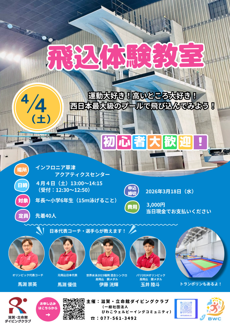 【飛込体験教室】 日時:2026年4月4日(土)13:00~14:15(12:30~12:50受付) 場所:インフロニア草津アクアティクスセンター 参加費:3,000円(税込) 当日受付にて現金でお支払いいただきます。おつりのないようご用意ください。